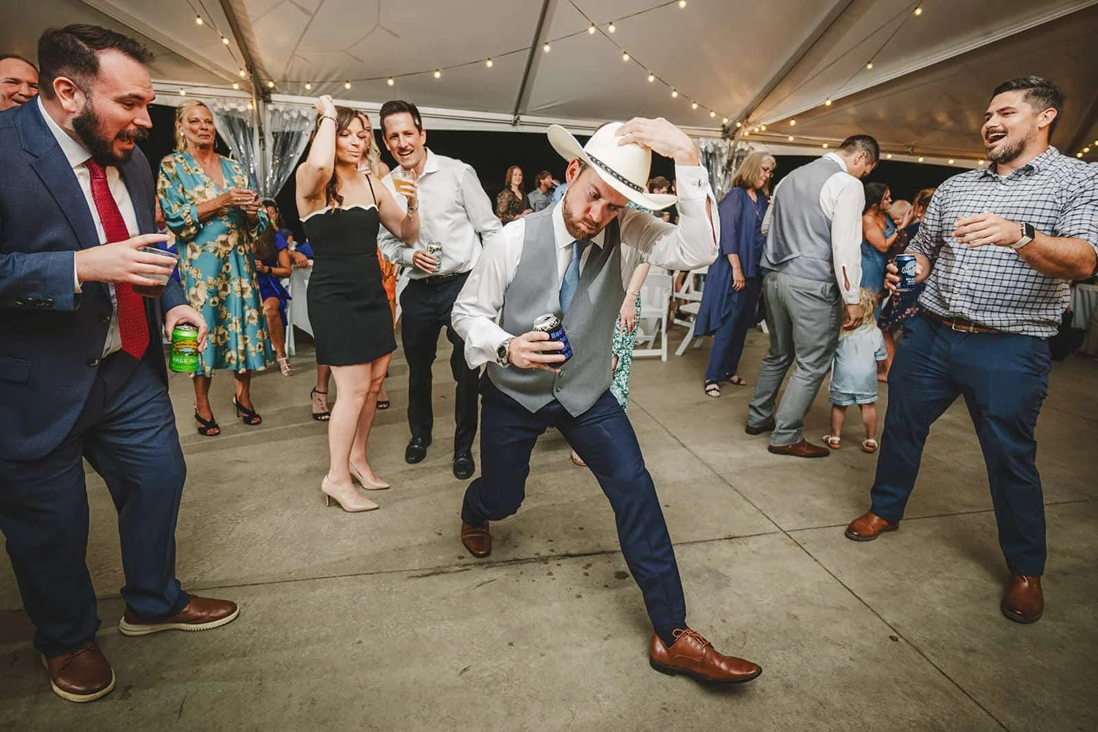 This option brings cocktail hour vibes with a view. Imagine sipping champagne as the waterfall hums in the background, or cozying up by the stone fireplace when the evening cools off. It’s laid-back but elevated—perfect for mingling, grabbing bites, and snapping candid photos as the sun dips behind the bluffs. I've had couples use the main reception hall for dinner and most of the formalities, and then bring the party out to the tent for the rest of the evening! The bluffs and the fountain really take on a different vibe once the stars come out.